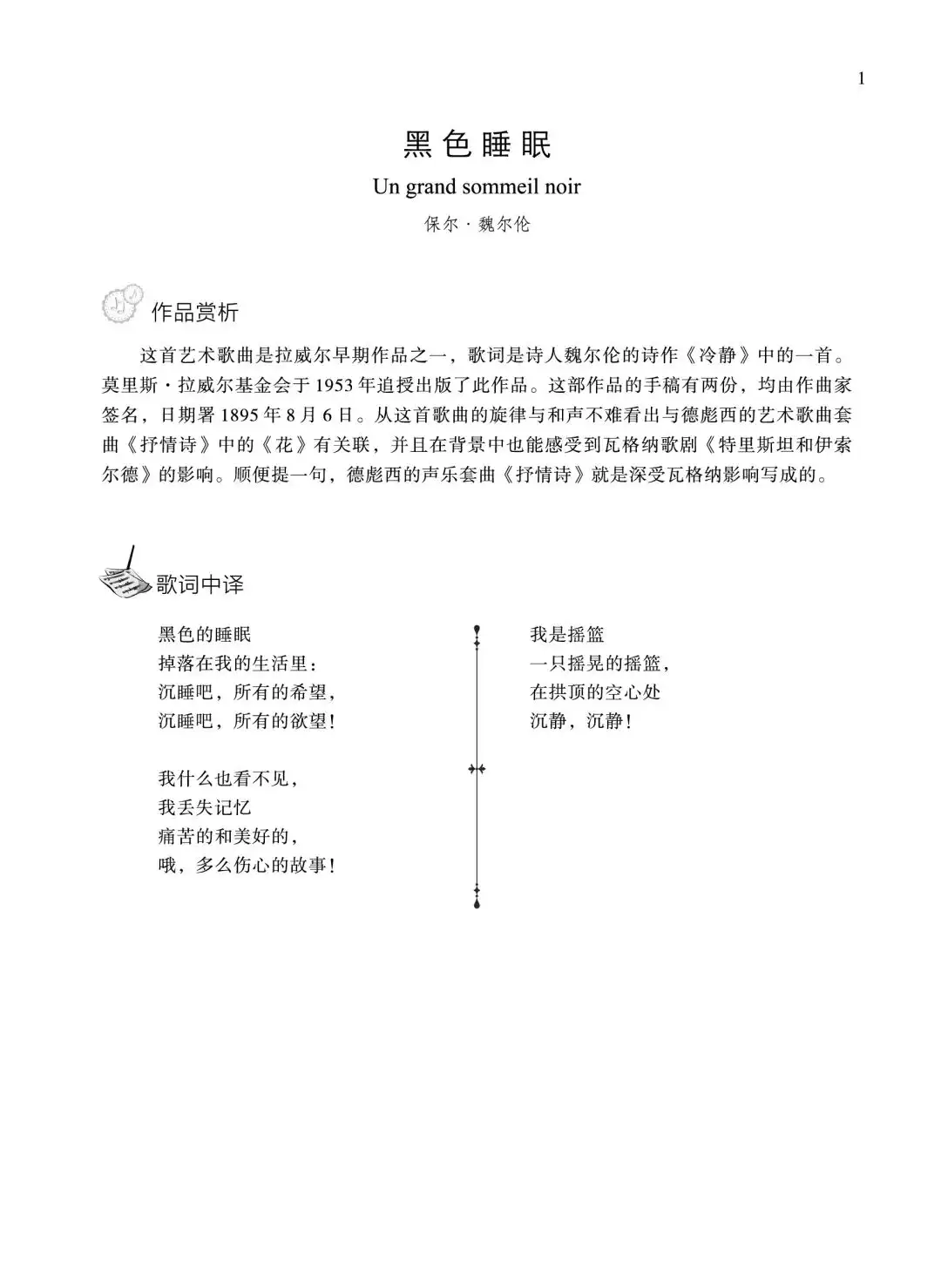 本书收录的27首艺术歌曲,展现了作曲家不同时期的风格。每首作品前附有生动形象的作品简介,帮助演唱者更好地了解作品背景。作者还商请了上海著名法文翻译家马振骋先生,合作翻译拉威尔艺术歌曲的诗歌歌词。诗歌中的幽默、纯真的情感在马老先生的笔下显得更生动而感人。为我们展现了诗歌原作的精美,让歌者更加容易理解音乐对诗歌的完美诠释,帮助歌者得以准确地演绎作品。
