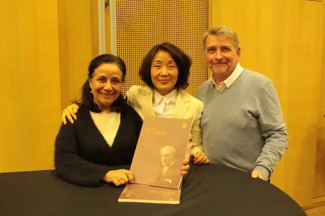 邱曙苇带着新书与马兰·马雷音乐学院院长(右)